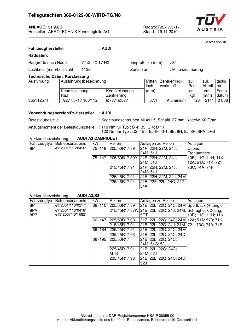 Dieses Gutachten (teilegutachten) bezieht sich auf die Alufelge ATS T927 7 in der Ausführung 7.5Jx17 ET 0, Mittenloch 0 mm . Im PDF findest du typischerweise zulässige Reifengrößen, Auflagen/Anbauhinweise und – je nach Dokument – Hinweise zur Eintragung.
