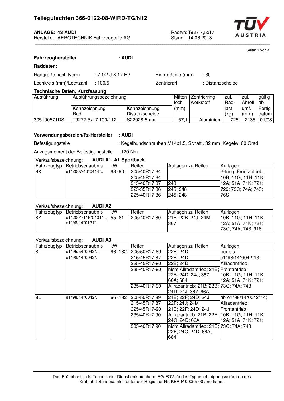 Dieses Gutachten (teilegutachten) bezieht sich auf die Alufelge ATS T927 7 in der Ausführung 7.5Jx17 ET 0, Mittenloch 0 mm . Im PDF findest du typischerweise zulässige Reifengrößen, Auflagen/Anbauhinweise und – je nach Dokument – Hinweise zur Eintragung.