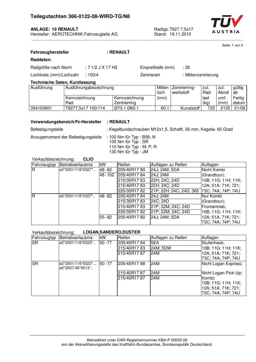 Dieses Gutachten (teilegutachten) bezieht sich auf die Alufelge ATS T927 7 in der Ausführung 7.5Jx17 ET 0, Mittenloch 0 mm . Im PDF findest du typischerweise zulässige Reifengrößen, Auflagen/Anbauhinweise und – je nach Dokument – Hinweise zur Eintragung.