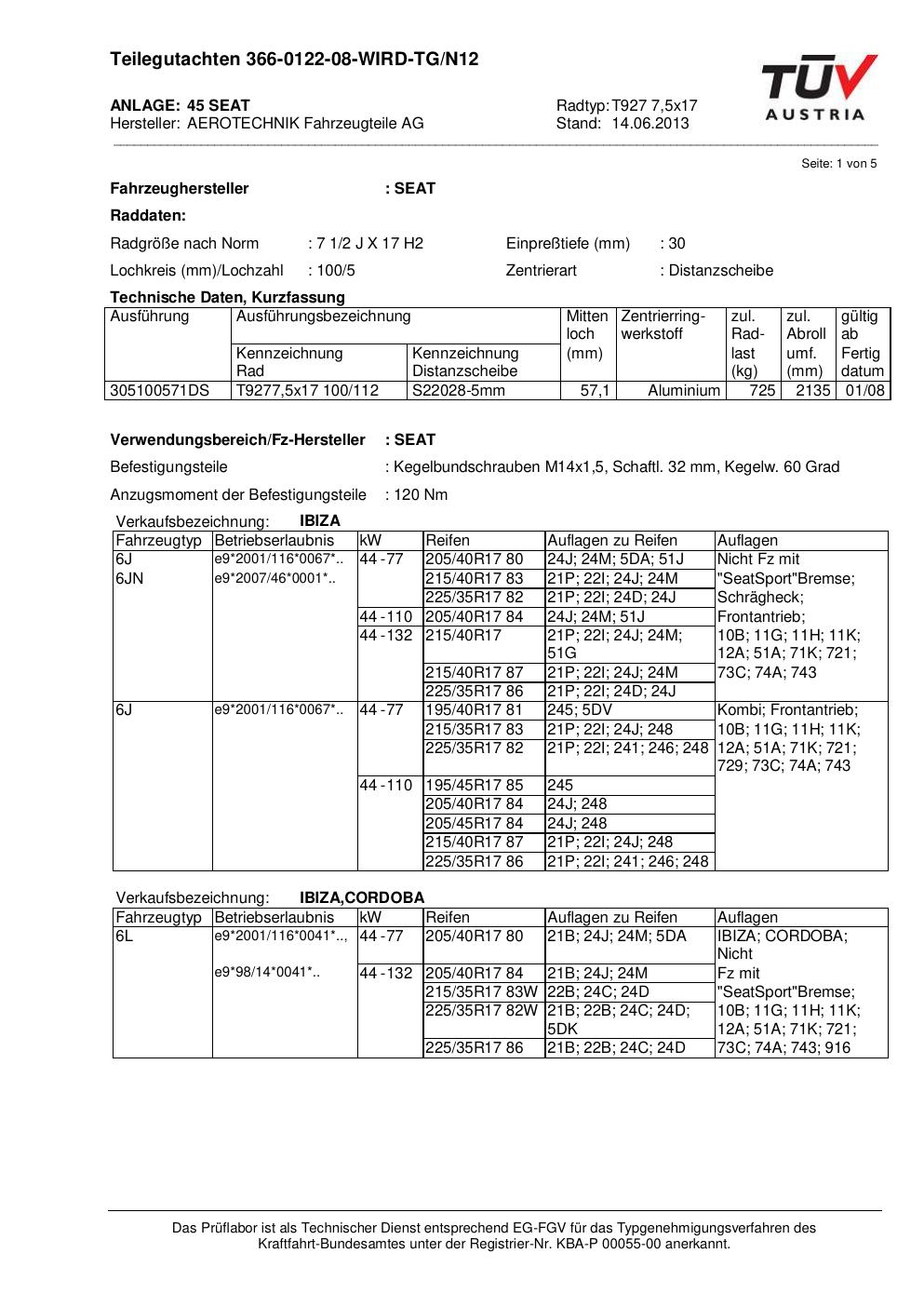 Dieses Gutachten (teilegutachten) bezieht sich auf die Alufelge ATS T927 7 in der Ausführung 7.5Jx17 ET 0, Mittenloch 0 mm . Im PDF findest du typischerweise zulässige Reifengrößen, Auflagen/Anbauhinweise und – je nach Dokument – Hinweise zur Eintragung.