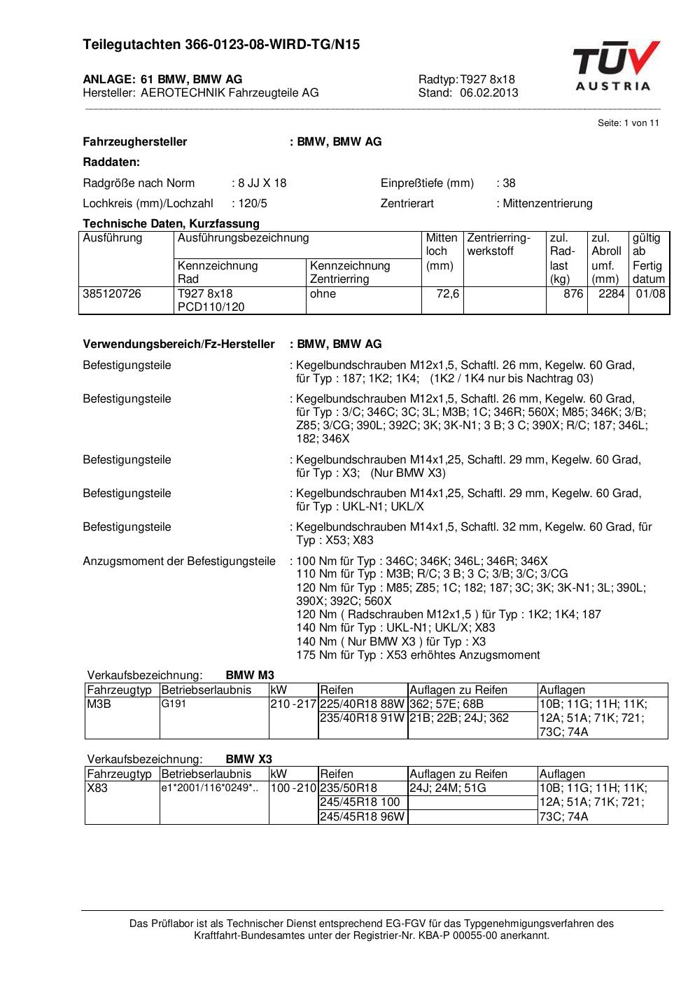 teilegutachten nicht ATS T927 8x18