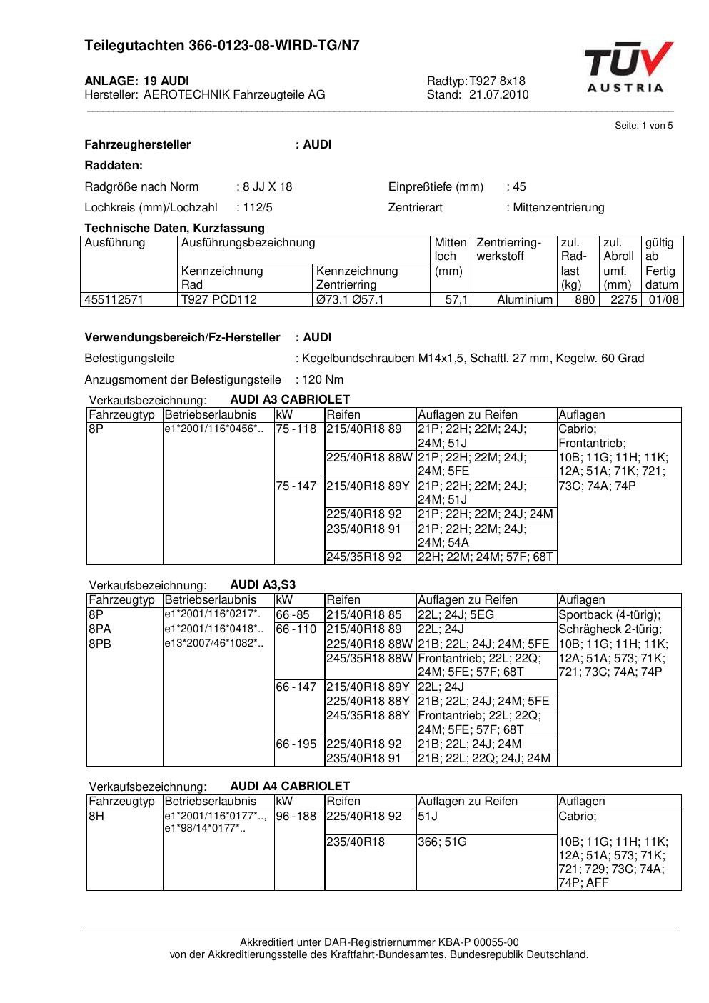 teilegutachten nicht ATS T927 8x18