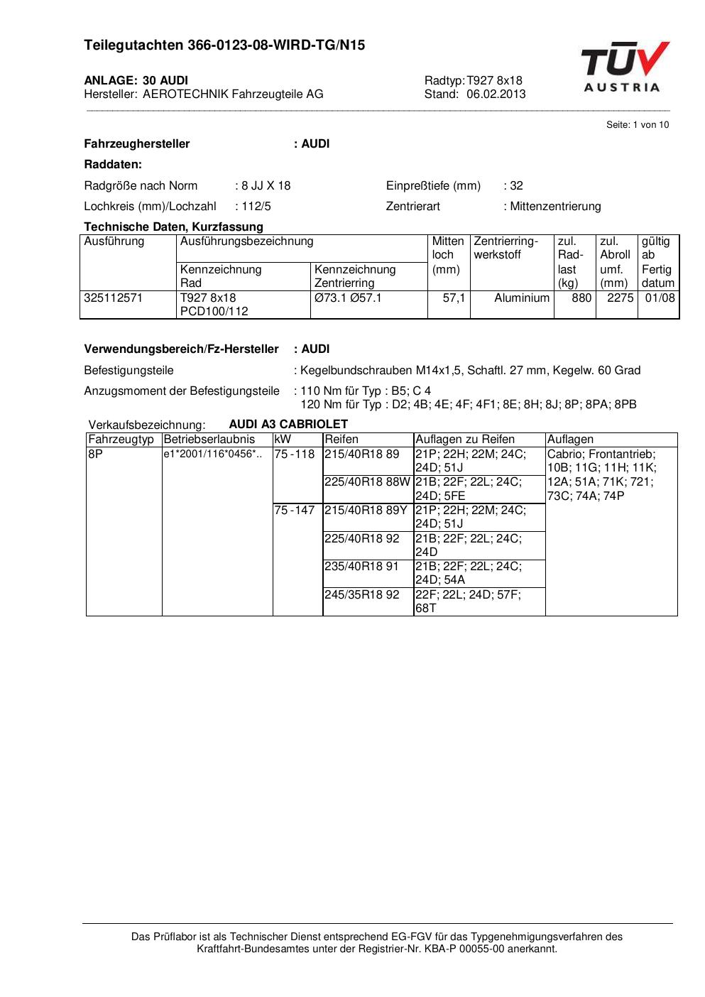 teilegutachten nicht ATS T927 8x18