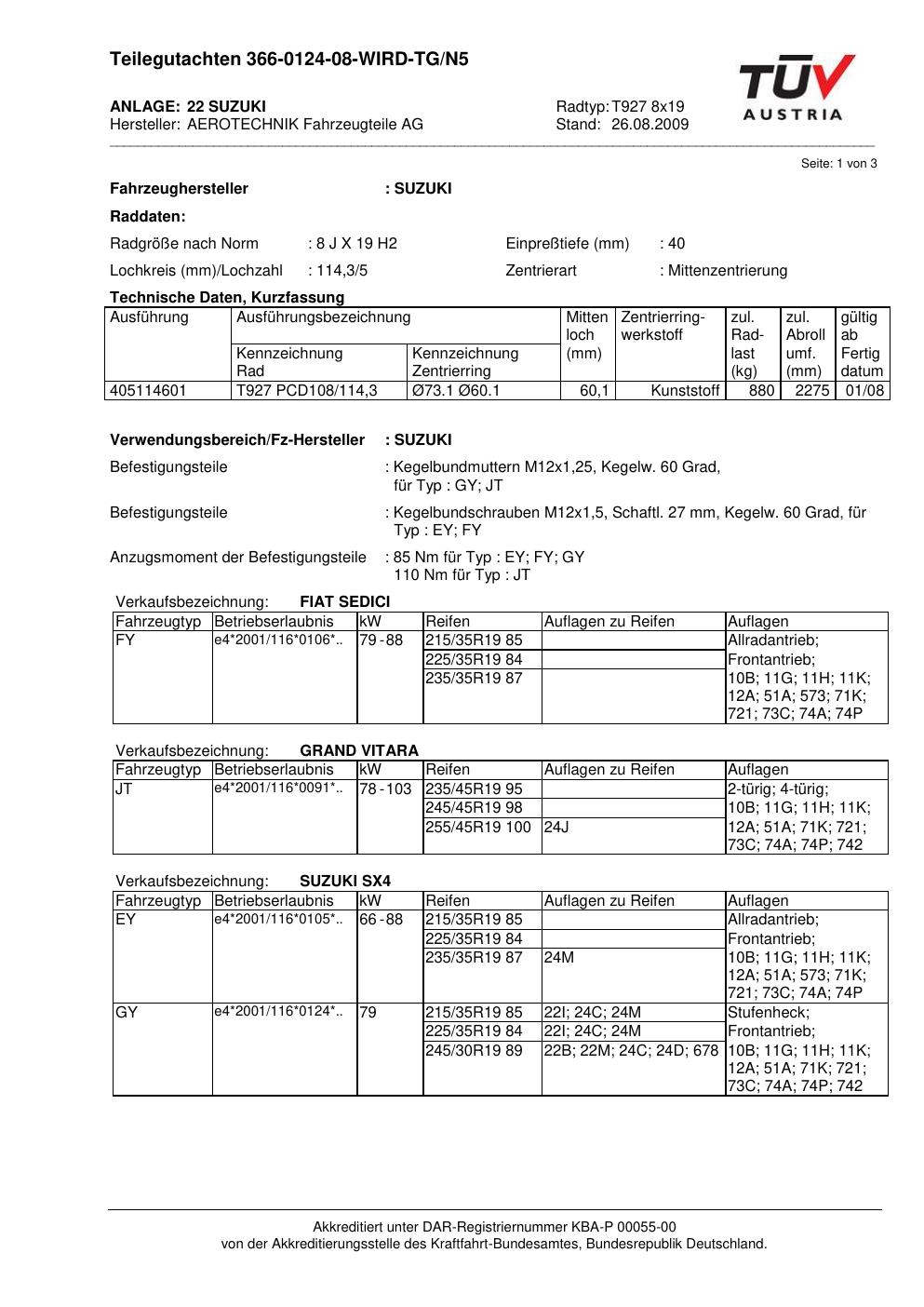 Dieses Gutachten (teilegutachten) bezieht sich auf die Alufelge ATS T927 8x19 in der Ausführung 8Jx19 ET 0, Mittenloch 0 mm . Im PDF findest du typischerweise zulässige Reifengrößen, Auflagen/Anbauhinweise und – je nach Dokument – Hinweise zur Eintragung.