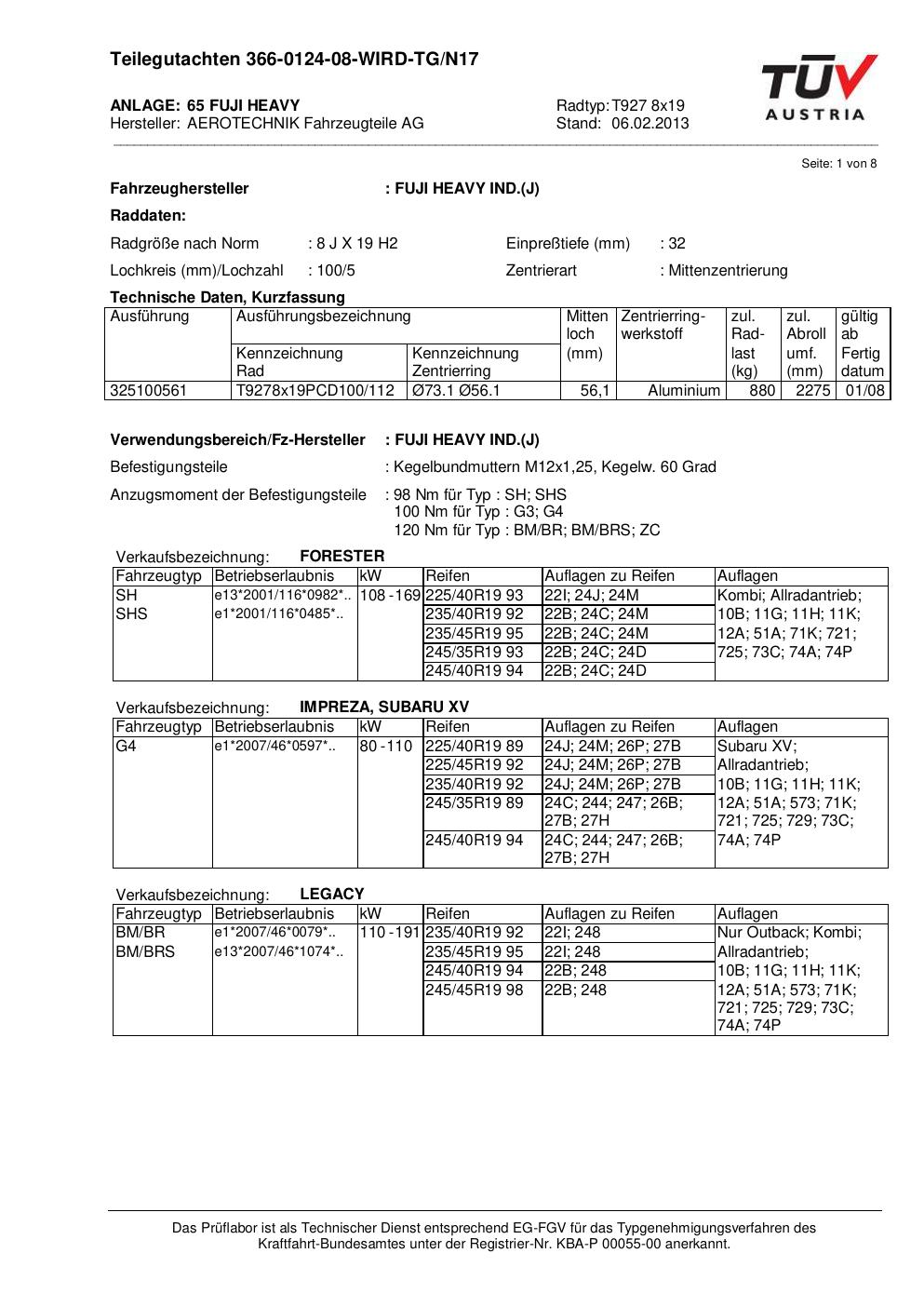 Dieses Gutachten (teilegutachten) bezieht sich auf die Alufelge ATS T927 8x19 in der Ausführung 8Jx19 ET 0, Mittenloch 0 mm . Im PDF findest du typischerweise zulässige Reifengrößen, Auflagen/Anbauhinweise und – je nach Dokument – Hinweise zur Eintragung.