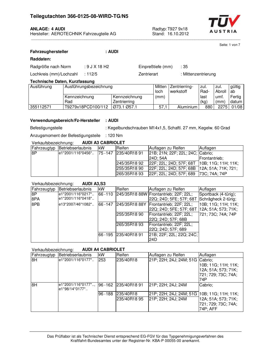 Dieses Gutachten (teilegutachten) bezieht sich auf die Alufelge ATS T927 9x18 in der Ausführung 9Jx18 ET 0, Mittenloch 0 mm . Im PDF findest du typischerweise zulässige Reifengrößen, Auflagen/Anbauhinweise und – je nach Dokument – Hinweise zur Eintragung.