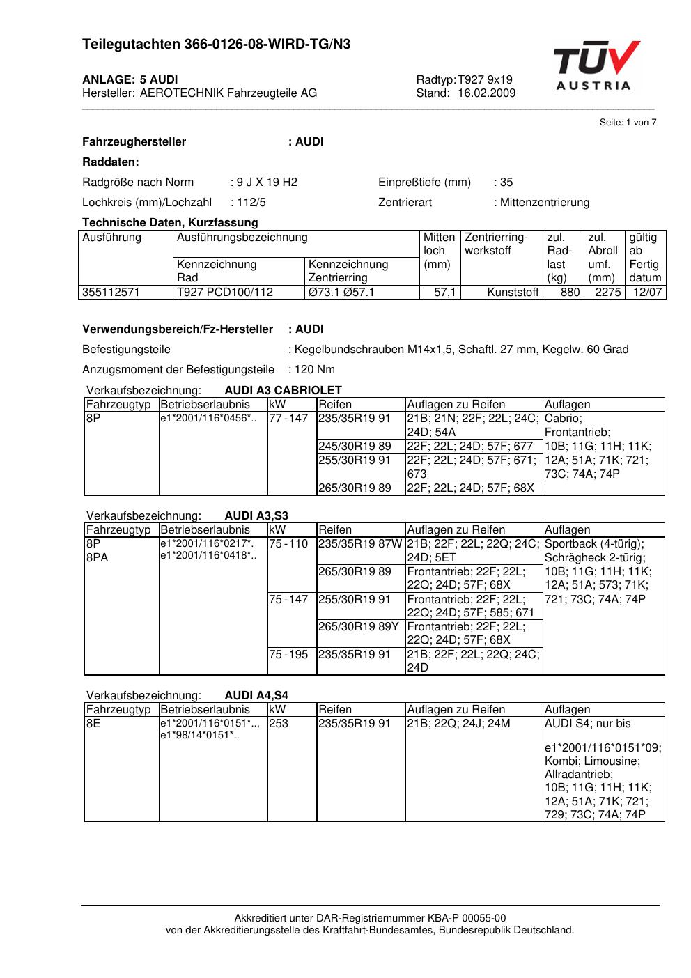 Dieses Gutachten (teilegutachten) bezieht sich auf die Alufelge ATS T927 9x19 in der Ausführung 9Jx19 ET 0, Mittenloch 0 mm . Im PDF findest du typischerweise zulässige Reifengrößen, Auflagen/Anbauhinweise und – je nach Dokument – Hinweise zur Eintragung.