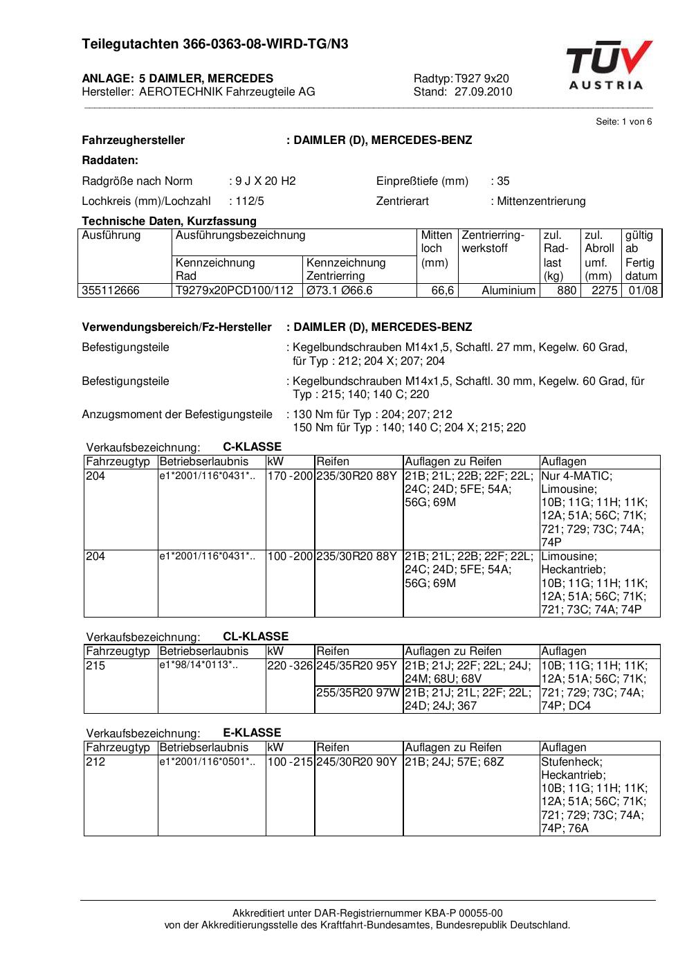 Dieses Gutachten (teilegutachten) bezieht sich auf die Alufelge ATS T927 9x20 in der Ausführung 9Jx2 ET 0, Mittenloch 0 mm . Im PDF findest du typischerweise zulässige Reifengrößen, Auflagen/Anbauhinweise und – je nach Dokument – Hinweise zur Eintragung.