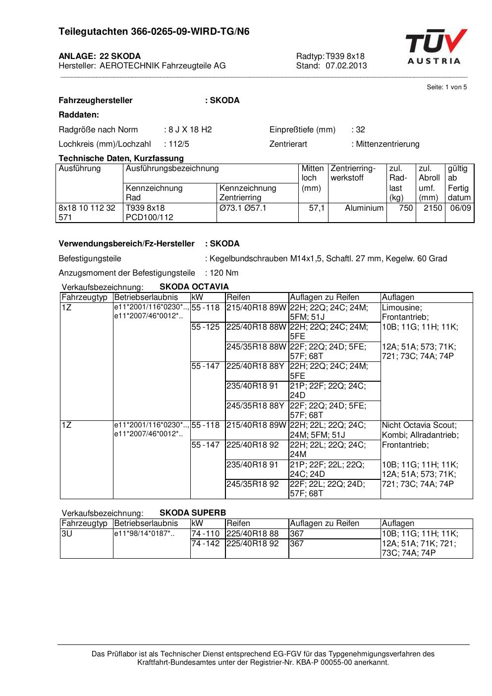 Dieses Gutachten (teilegutachten) bezieht sich auf die Alufelge ATS T939 8x18 in der Ausführung 8Jx18 ET 0, Mittenloch 0 mm . Im PDF findest du typischerweise zulässige Reifengrößen, Auflagen/Anbauhinweise und – je nach Dokument – Hinweise zur Eintragung.