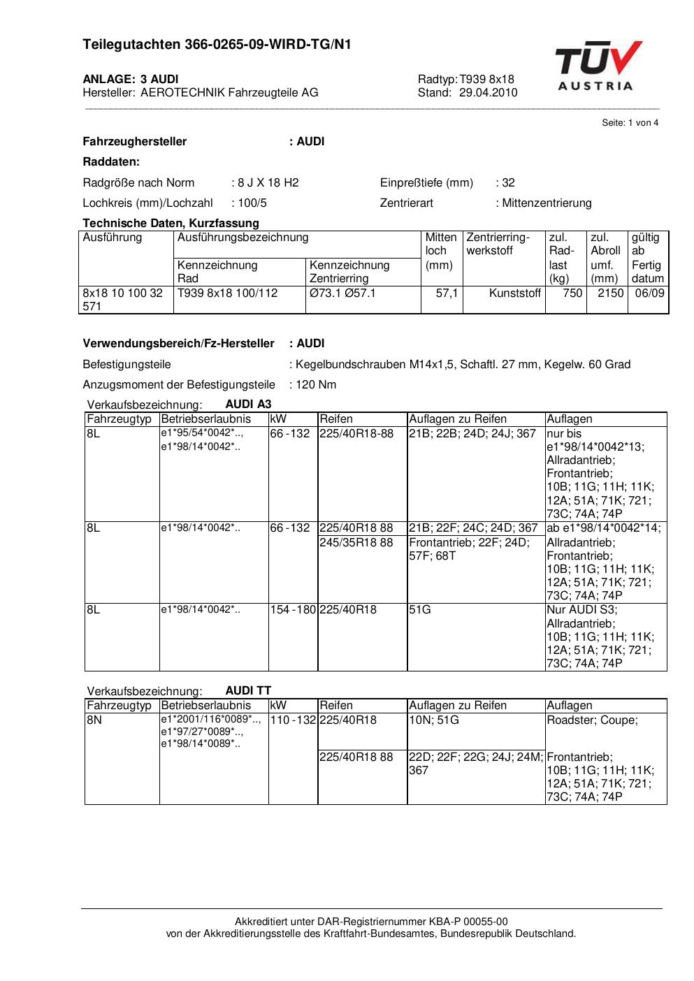 Dieses Gutachten (teilegutachten) bezieht sich auf die Alufelge ATS T939 8x18 in der Ausführung 8Jx18 ET 0, Mittenloch 0 mm . Im PDF findest du typischerweise zulässige Reifengrößen, Auflagen/Anbauhinweise und – je nach Dokument – Hinweise zur Eintragung.