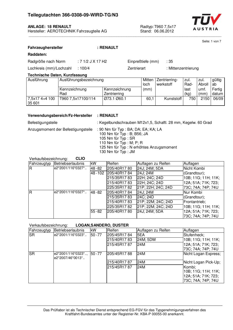 Dieses Gutachten (teilegutachten) bezieht sich auf die Alufelge ATS T960 7 in der Ausführung 7.5Jx17 ET 0, Mittenloch 0 mm . Im PDF findest du typischerweise zulässige Reifengrößen, Auflagen/Anbauhinweise und – je nach Dokument – Hinweise zur Eintragung.