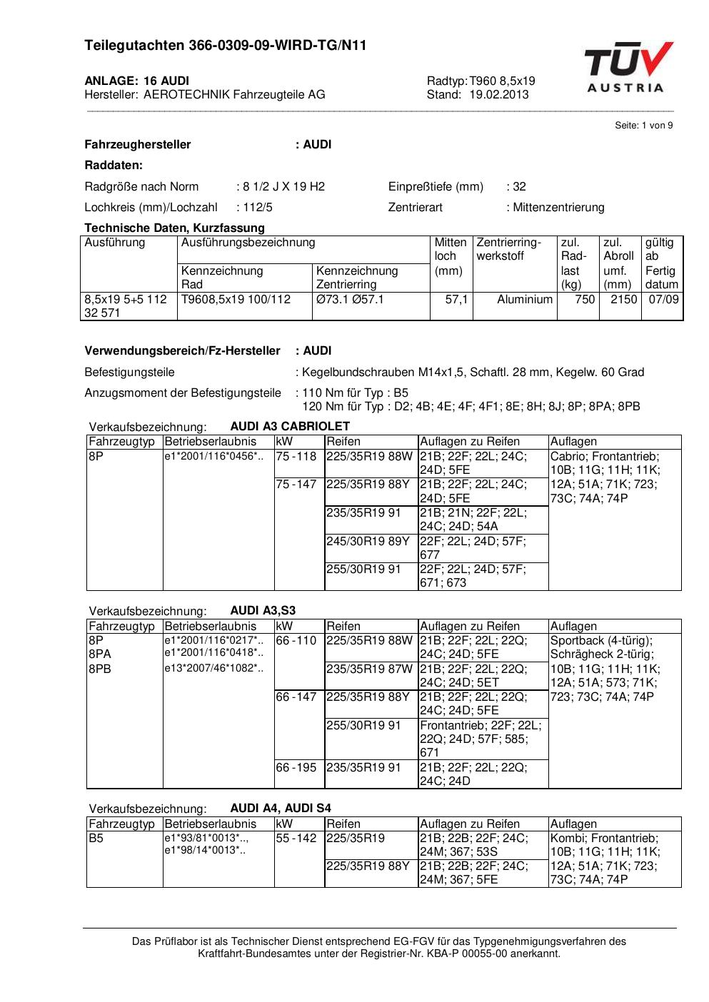 Dieses Gutachten (teilegutachten) bezieht sich auf die Alufelge ATS T960 8 in der Ausführung 8.5Jx19 ET 0, Mittenloch 0 mm . Im PDF findest du typischerweise zulässige Reifengrößen, Auflagen/Anbauhinweise und – je nach Dokument – Hinweise zur Eintragung.