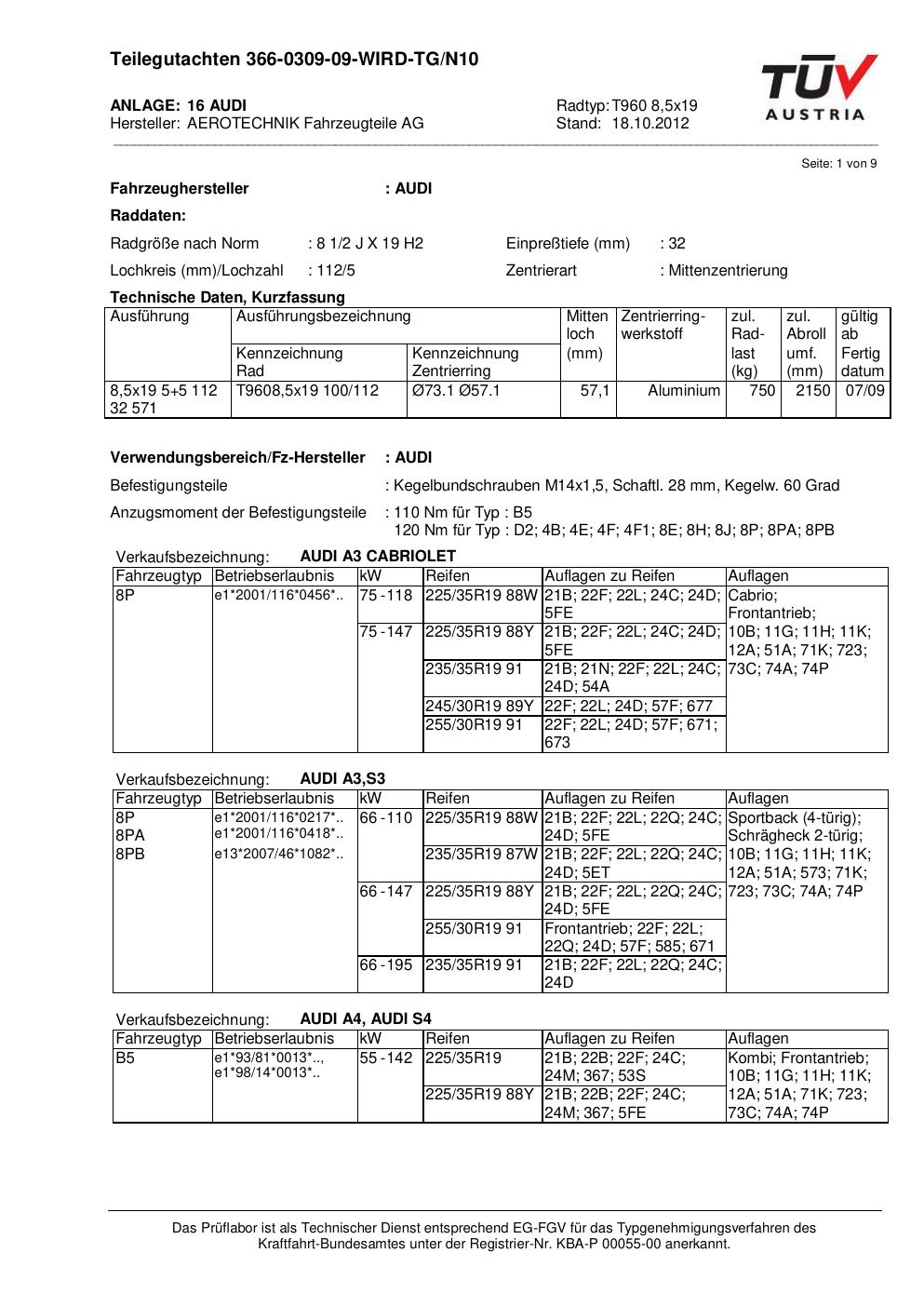 Dieses Gutachten (teilegutachten) bezieht sich auf die Alufelge ATS T960 8 in der Ausführung 8.5Jx19 ET 0, Mittenloch 0 mm . Im PDF findest du typischerweise zulässige Reifengrößen, Auflagen/Anbauhinweise und – je nach Dokument – Hinweise zur Eintragung.