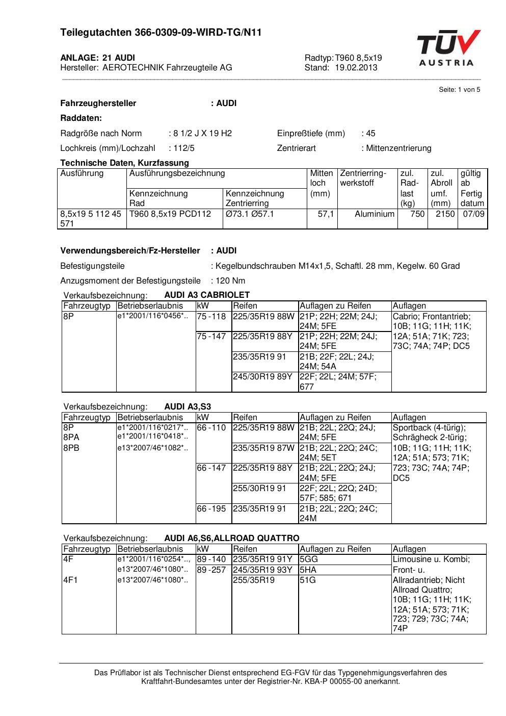 Dieses Gutachten (teilegutachten) bezieht sich auf die Alufelge ATS T960 8 in der Ausführung 8.5Jx19 ET 0, Mittenloch 0 mm . Im PDF findest du typischerweise zulässige Reifengrößen, Auflagen/Anbauhinweise und – je nach Dokument – Hinweise zur Eintragung.