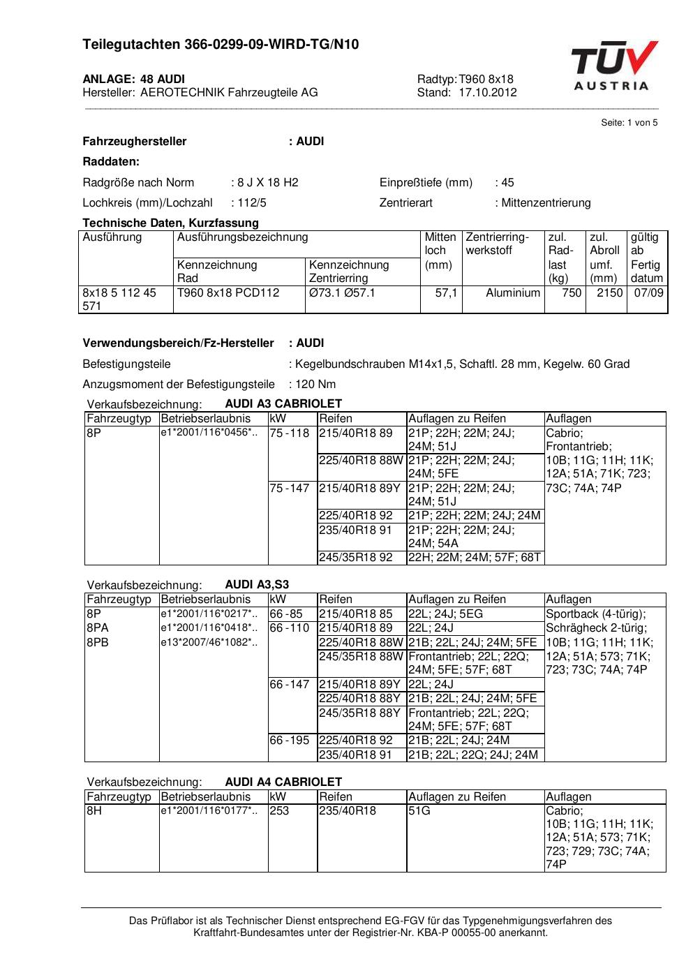 Dieses Gutachten (teilegutachten) bezieht sich auf die Alufelge ATS T960 8x18 in der Ausführung 8Jx18 ET 0, Mittenloch 0 mm . Im PDF findest du typischerweise zulässige Reifengrößen, Auflagen/Anbauhinweise und – je nach Dokument – Hinweise zur Eintragung.