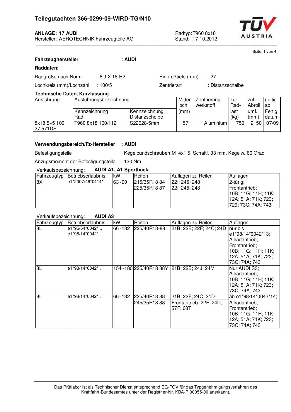 Dieses Gutachten (teilegutachten) bezieht sich auf die Alufelge ATS T960 8x18 in der Ausführung 8Jx18 ET 0, Mittenloch 0 mm . Im PDF findest du typischerweise zulässige Reifengrößen, Auflagen/Anbauhinweise und – je nach Dokument – Hinweise zur Eintragung.