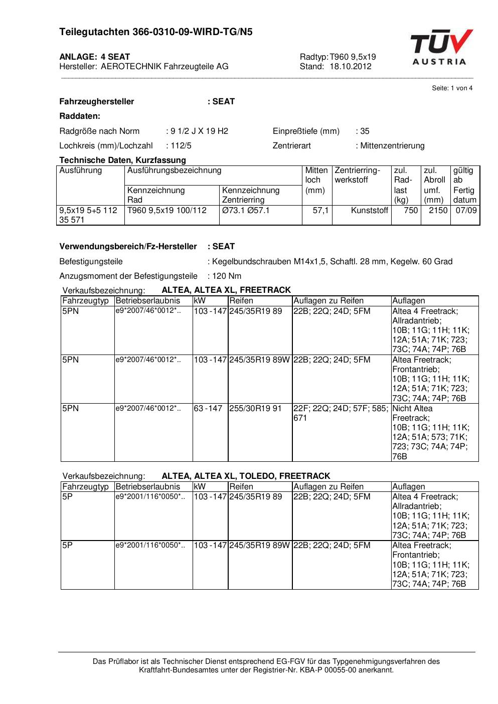 Dieses Gutachten (teilegutachten) bezieht sich auf die Alufelge ATS T960 9 in der Ausführung 9.5Jx19 ET 0, Mittenloch 0 mm . Im PDF findest du typischerweise zulässige Reifengrößen, Auflagen/Anbauhinweise und – je nach Dokument – Hinweise zur Eintragung.