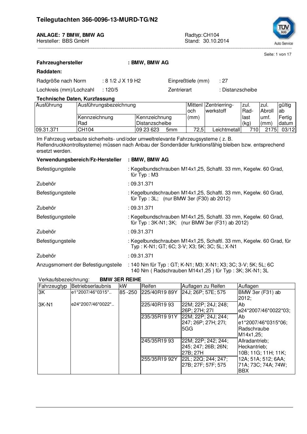 teilegutachten nicht BBS CH104