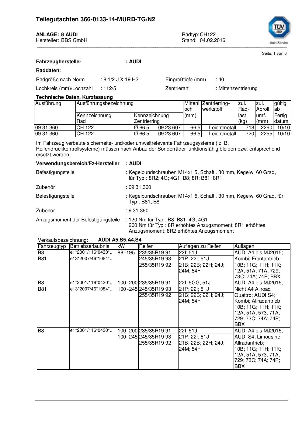 teilegutachten nicht BBS CH122