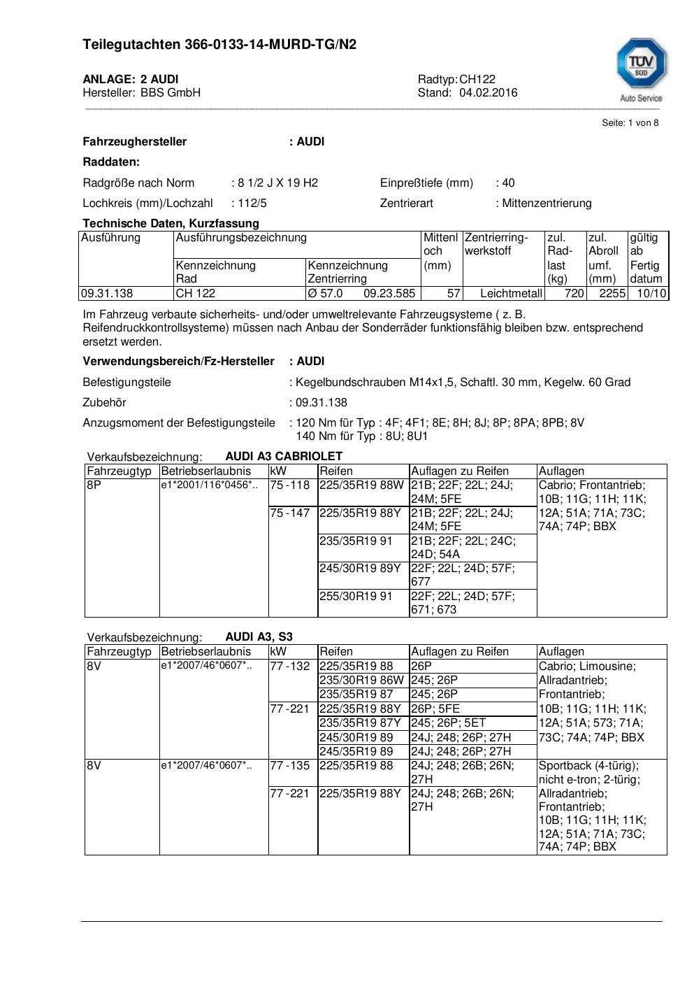 teilegutachten nicht BBS CH122