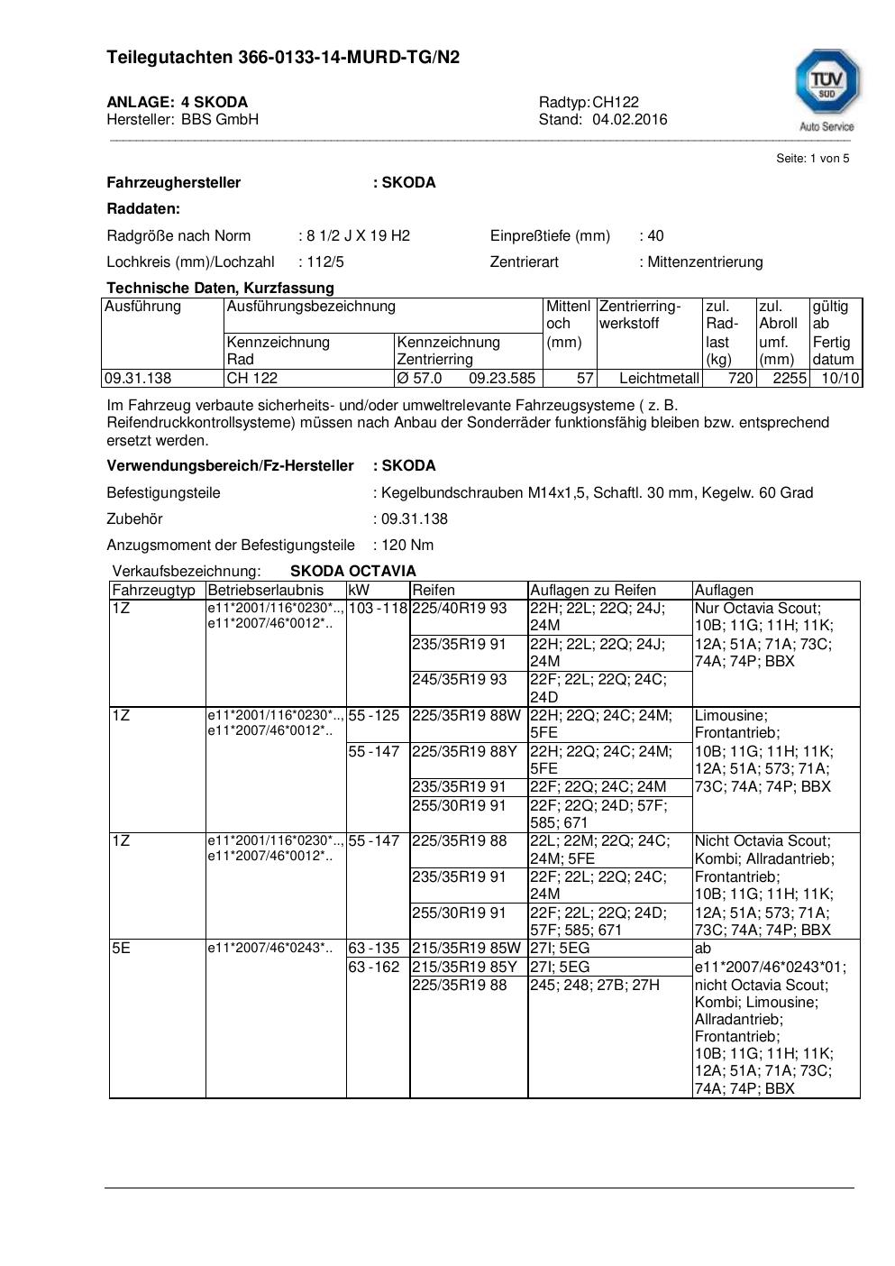 teilegutachten nicht BBS CH122