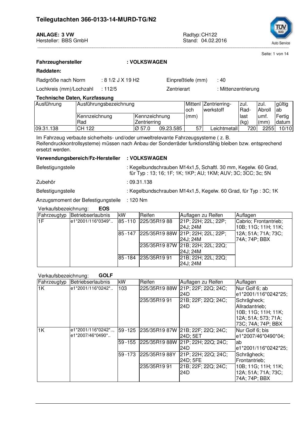teilegutachten nicht BBS CH122