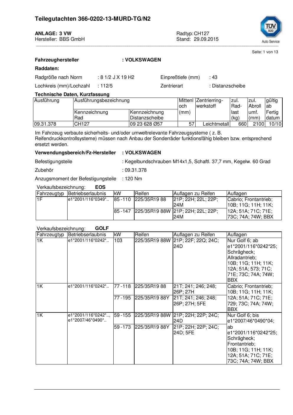 Dieses Gutachten (teilegutachten) bezieht sich auf die Alufelge BBS CH127 in der Ausführung 2Jx19 ET 0, Mittenloch 0 mm . Im PDF findest du typischerweise zulässige Reifengrößen, Auflagen/Anbauhinweise und – je nach Dokument – Hinweise zur Eintragung.