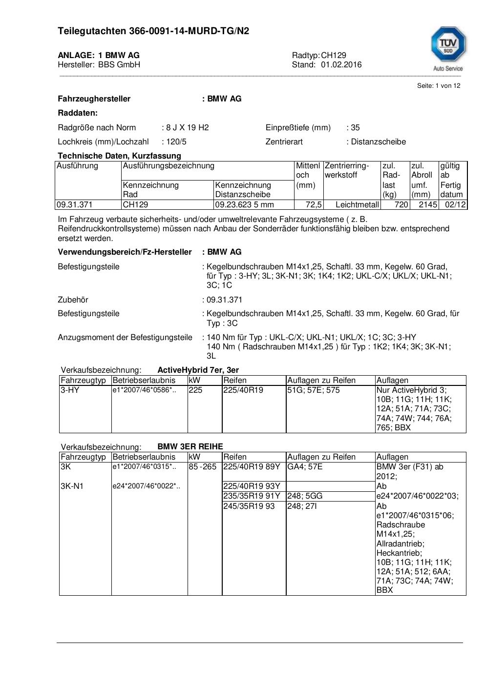 Dieses Gutachten (teilegutachten) bezieht sich auf die Alufelge BBS CH129 in der Ausführung 8Jx19 ET 0, Mittenloch 0 mm . Im PDF findest du typischerweise zulässige Reifengrößen, Auflagen/Anbauhinweise und – je nach Dokument – Hinweise zur Eintragung.