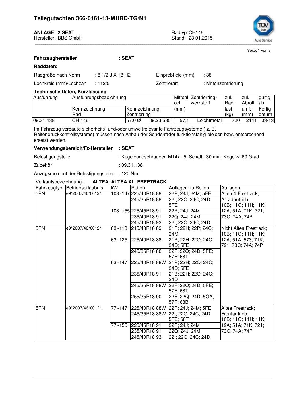 Dieses Gutachten (teilegutachten) bezieht sich auf die Alufelge BBS CH146 in der Ausführung 2Jx18 ET 0, Mittenloch 0 mm . Im PDF findest du typischerweise zulässige Reifengrößen, Auflagen/Anbauhinweise und – je nach Dokument – Hinweise zur Eintragung.
