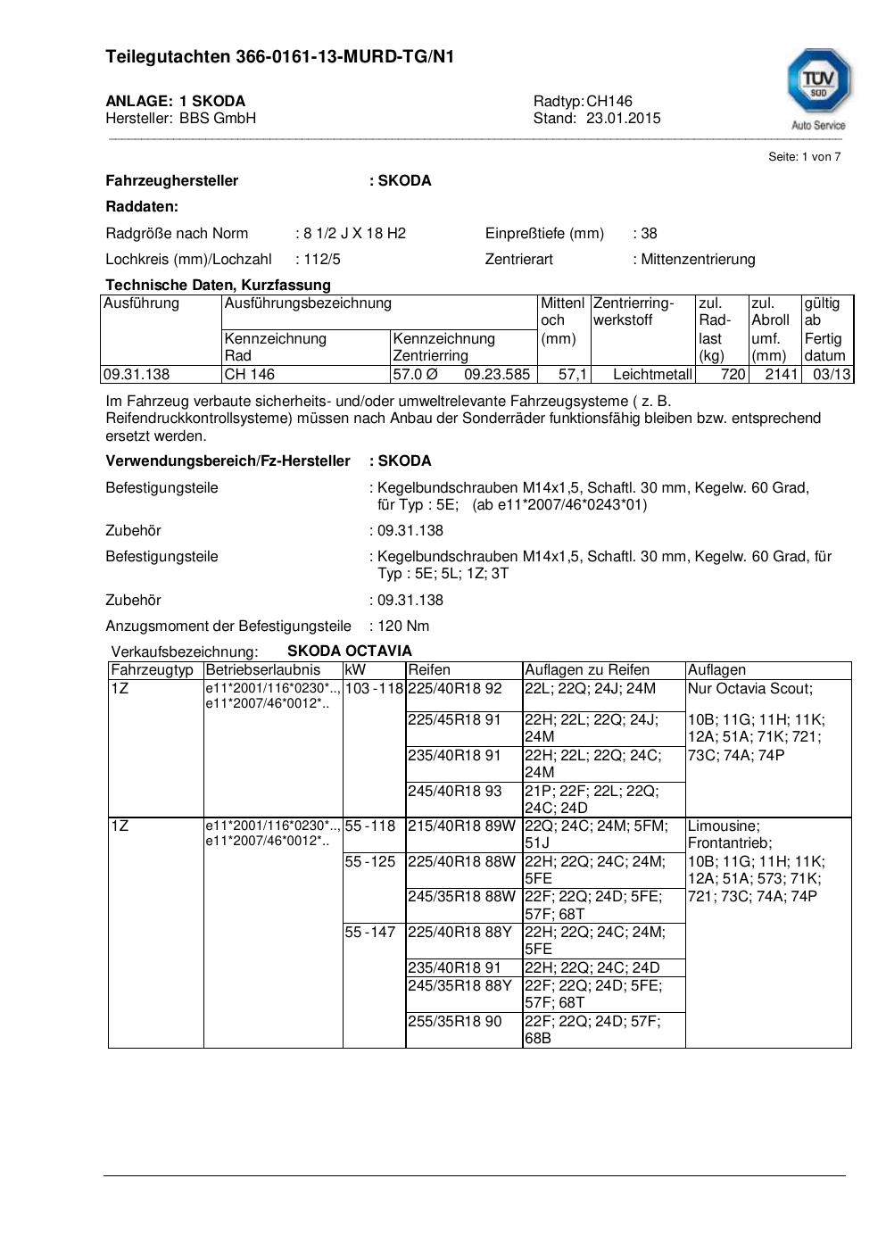 Dieses Gutachten (teilegutachten) bezieht sich auf die Alufelge BBS CH146 in der Ausführung 2Jx18 ET 0, Mittenloch 0 mm . Im PDF findest du typischerweise zulässige Reifengrößen, Auflagen/Anbauhinweise und – je nach Dokument – Hinweise zur Eintragung.