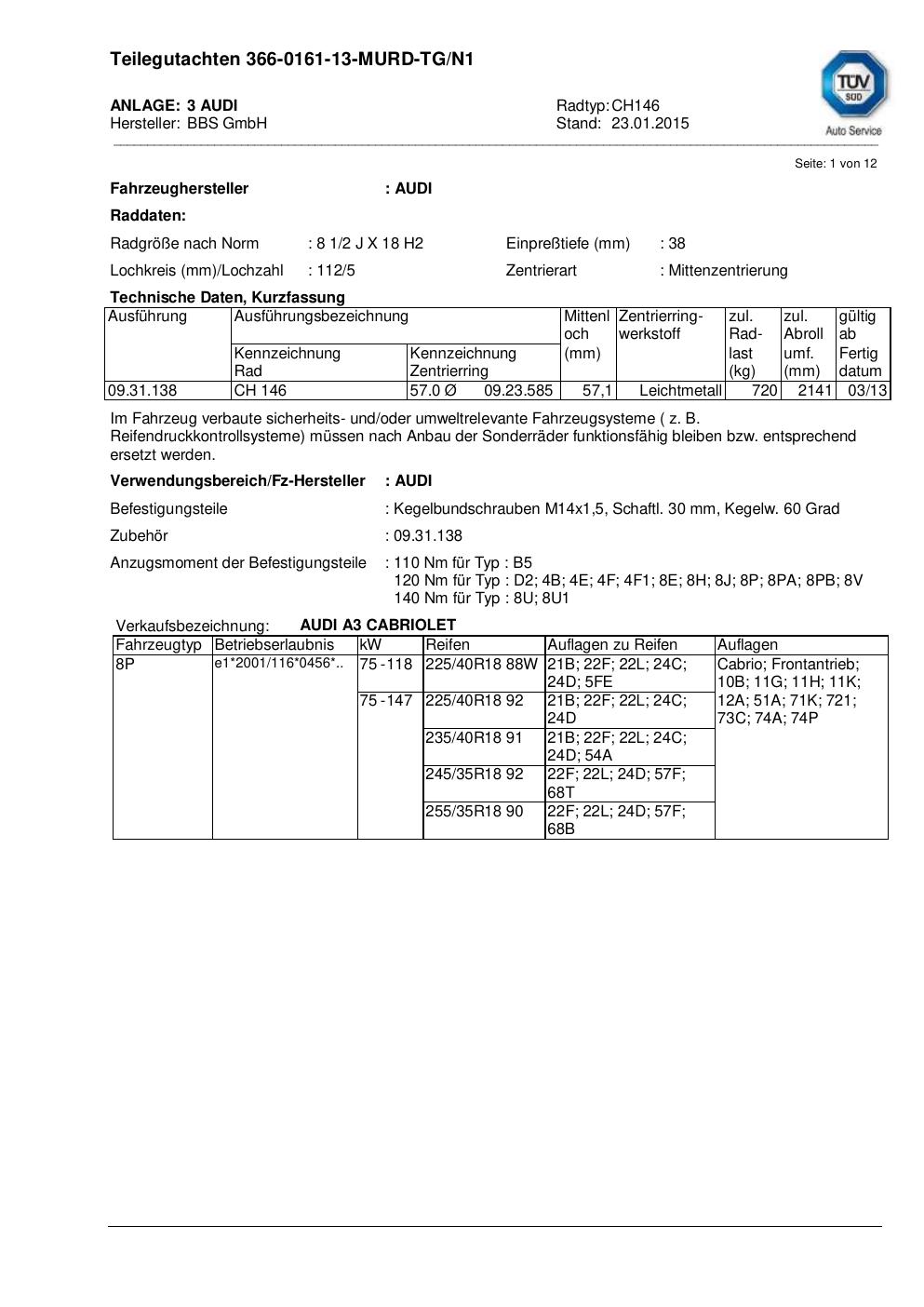 Dieses Gutachten (teilegutachten) bezieht sich auf die Alufelge BBS CH146 in der Ausführung 2Jx18 ET 0, Mittenloch 0 mm . Im PDF findest du typischerweise zulässige Reifengrößen, Auflagen/Anbauhinweise und – je nach Dokument – Hinweise zur Eintragung.