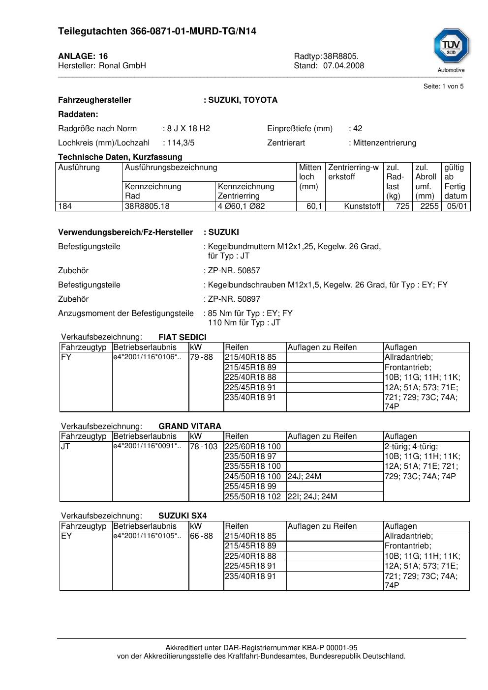 Dieses Gutachten (teilegutachten) bezieht sich auf die Alufelge Ronal 38R8805 in der Ausführung 8Jx18 ET 0, Mittenloch 0 mm . Im PDF findest du typischerweise zulässige Reifengrößen, Auflagen/Anbauhinweise und – je nach Dokument – Hinweise zur Eintragung.