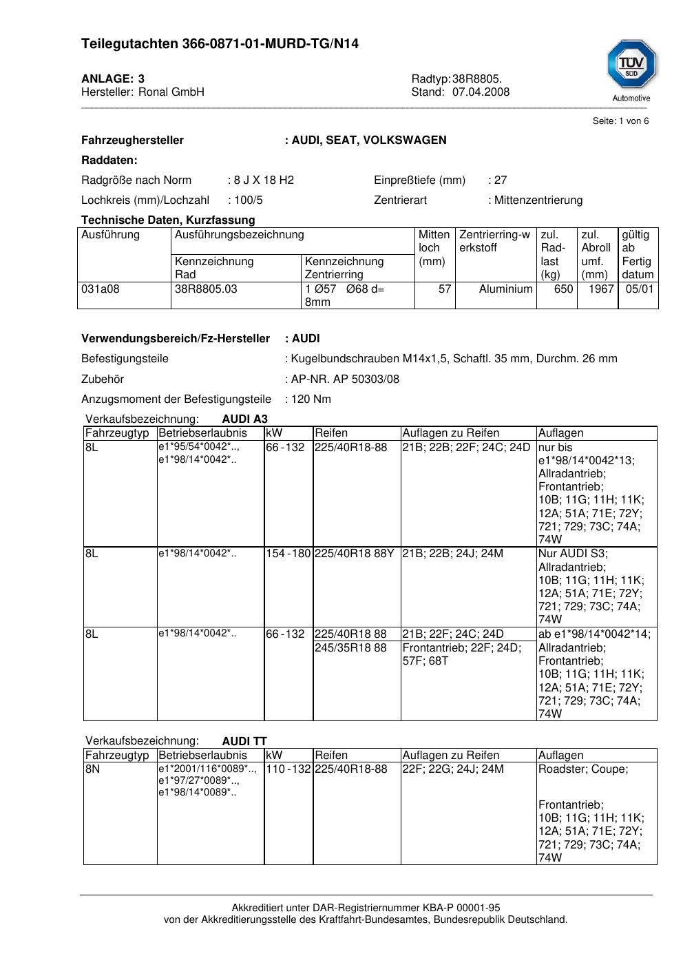 teilegutachten nicht brand-ronal 38R8805