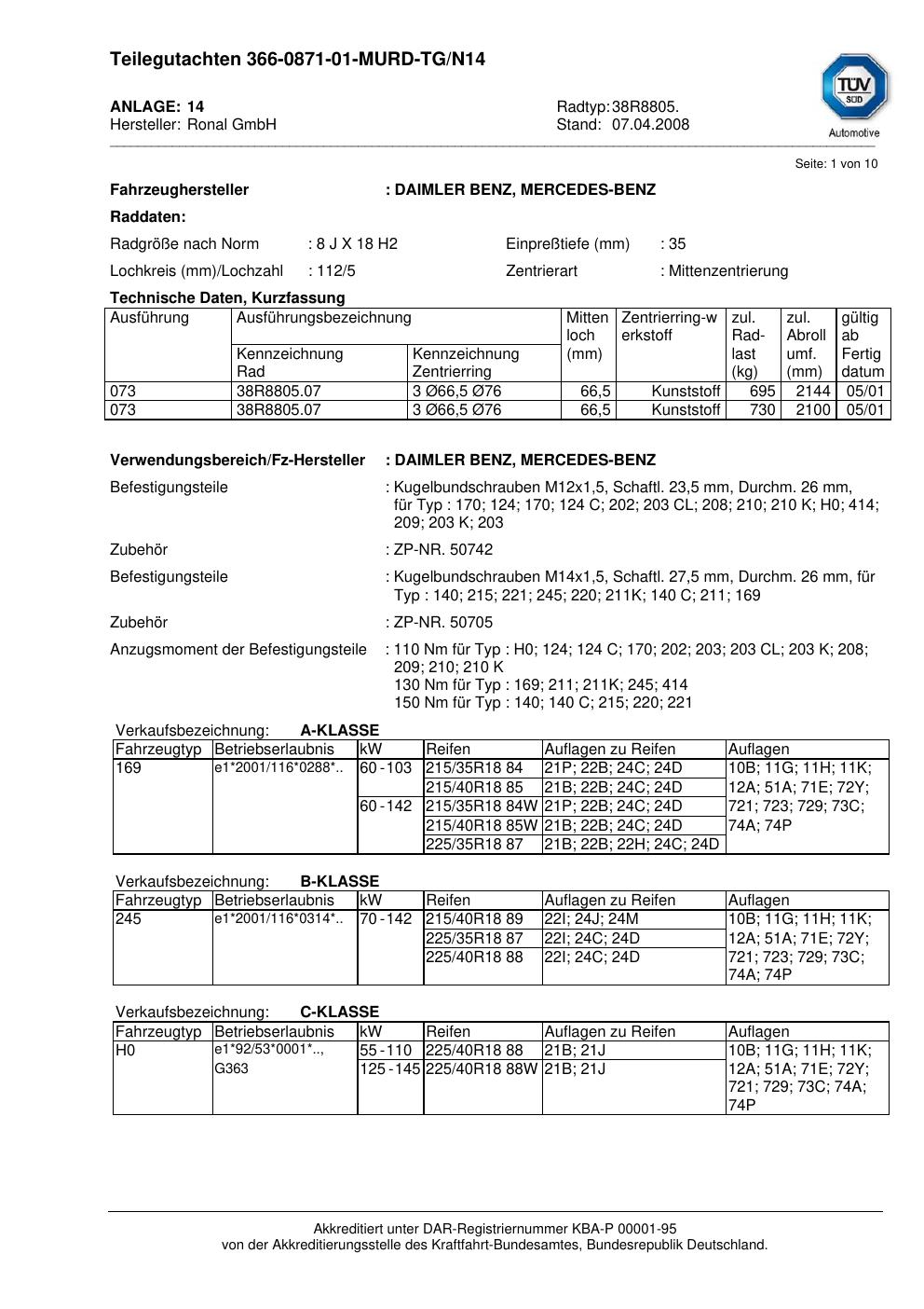 teilegutachten nicht Ronal 38R8805
