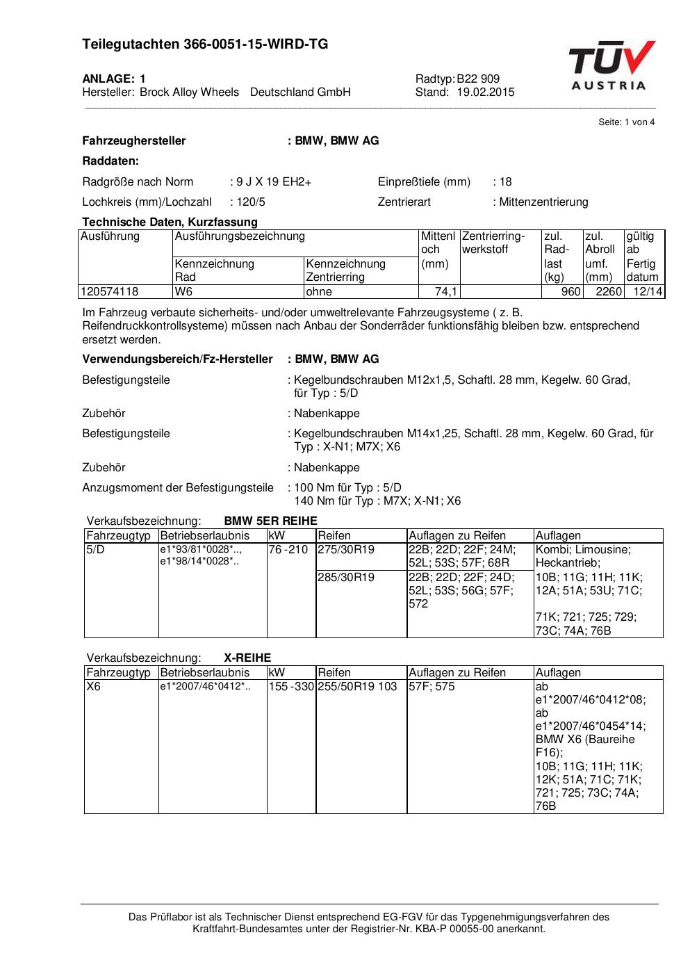 Dieses Gutachten (teilegutachten) bezieht sich auf die Alufelge Brock B22 909 in der Ausführung 9Jx19 ET 0, Mittenloch 0 mm . Im PDF findest du typischerweise zulässige Reifengrößen, Auflagen/Anbauhinweise und – je nach Dokument – Hinweise zur Eintragung.
