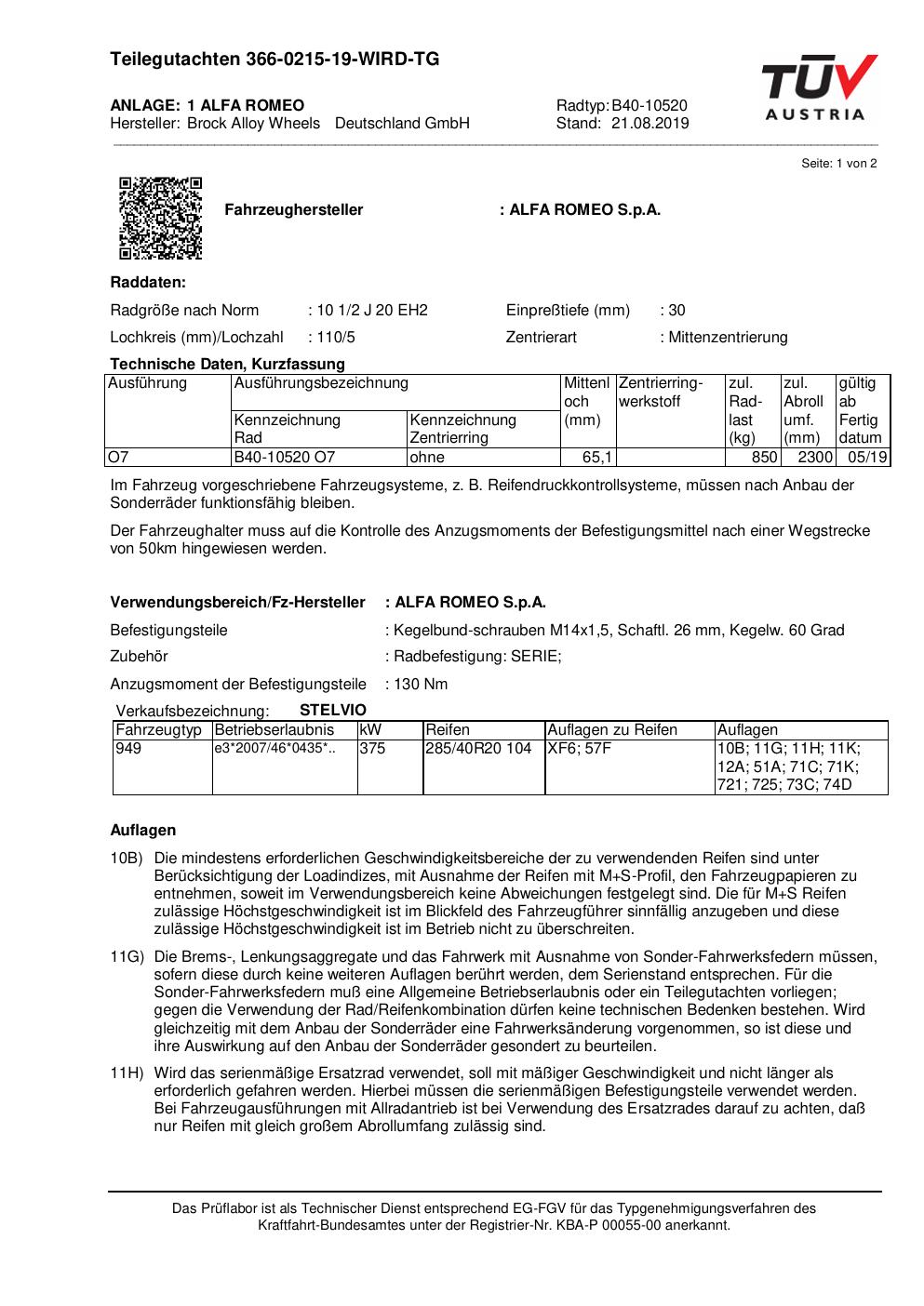 Dieses Gutachten (teilegutachten) bezieht sich auf die Alufelge Brock B40-10520 in der Ausführung ET 0, Mittenloch 0 mm . Im PDF findest du typischerweise zulässige Reifengrößen, Auflagen/Anbauhinweise und – je nach Dokument – Hinweise zur Eintragung.