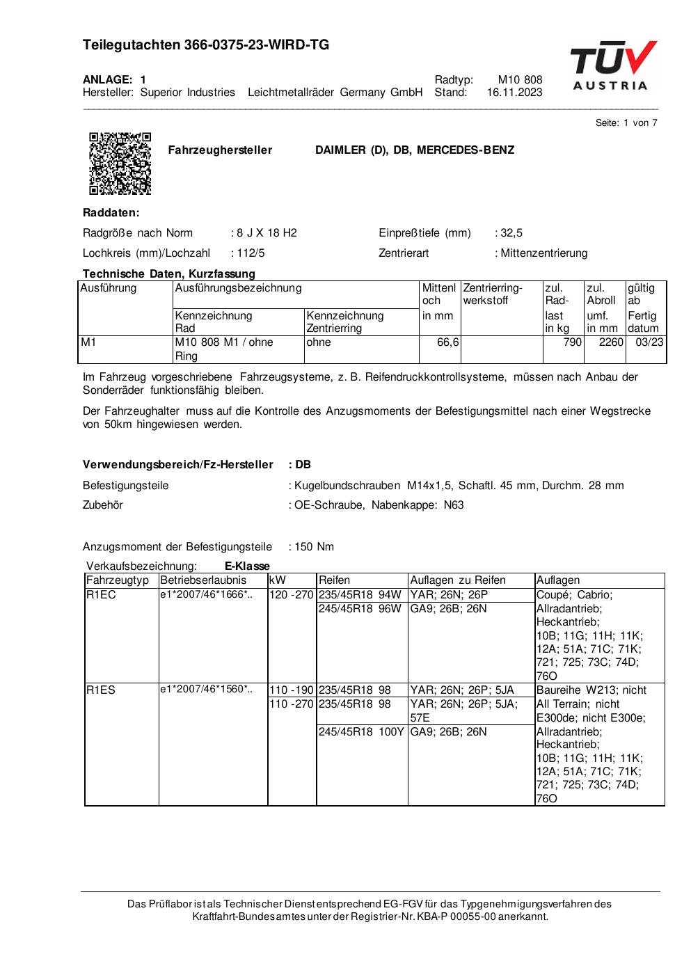 Dieses Gutachten (teilegutachten) bezieht sich auf die Alufelge Superior M10 808 in der Ausführung 8Jx18 ET 0, Mittenloch 0 mm . Im PDF findest du typischerweise zulässige Reifengrößen, Auflagen/Anbauhinweise und – je nach Dokument – Hinweise zur Eintragung.