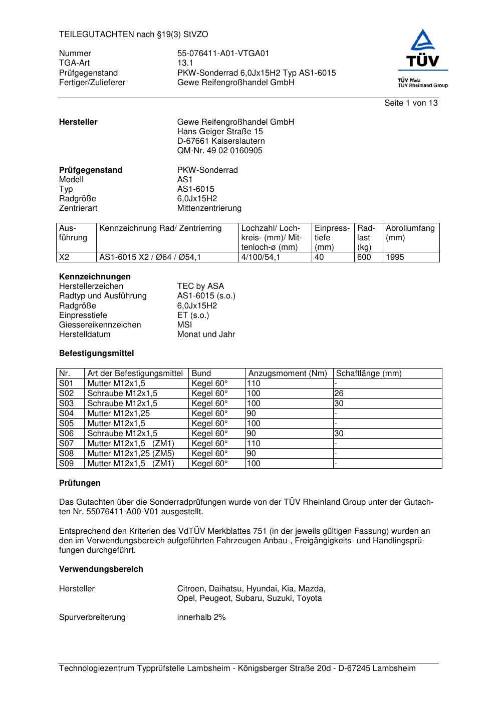 teilegutachten umfasst ATS AS1-6015