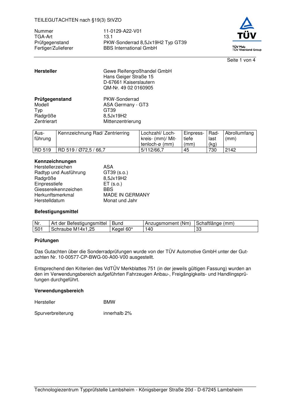 Dieses Gutachten (teilegutachten) bezieht sich auf die Alufelge BBS GT39 in der Ausführung 8.5Jx19 ET 0, Mittenloch 0 mm . Im PDF findest du typischerweise zulässige Reifengrößen, Auflagen/Anbauhinweise und – je nach Dokument – Hinweise zur Eintragung.