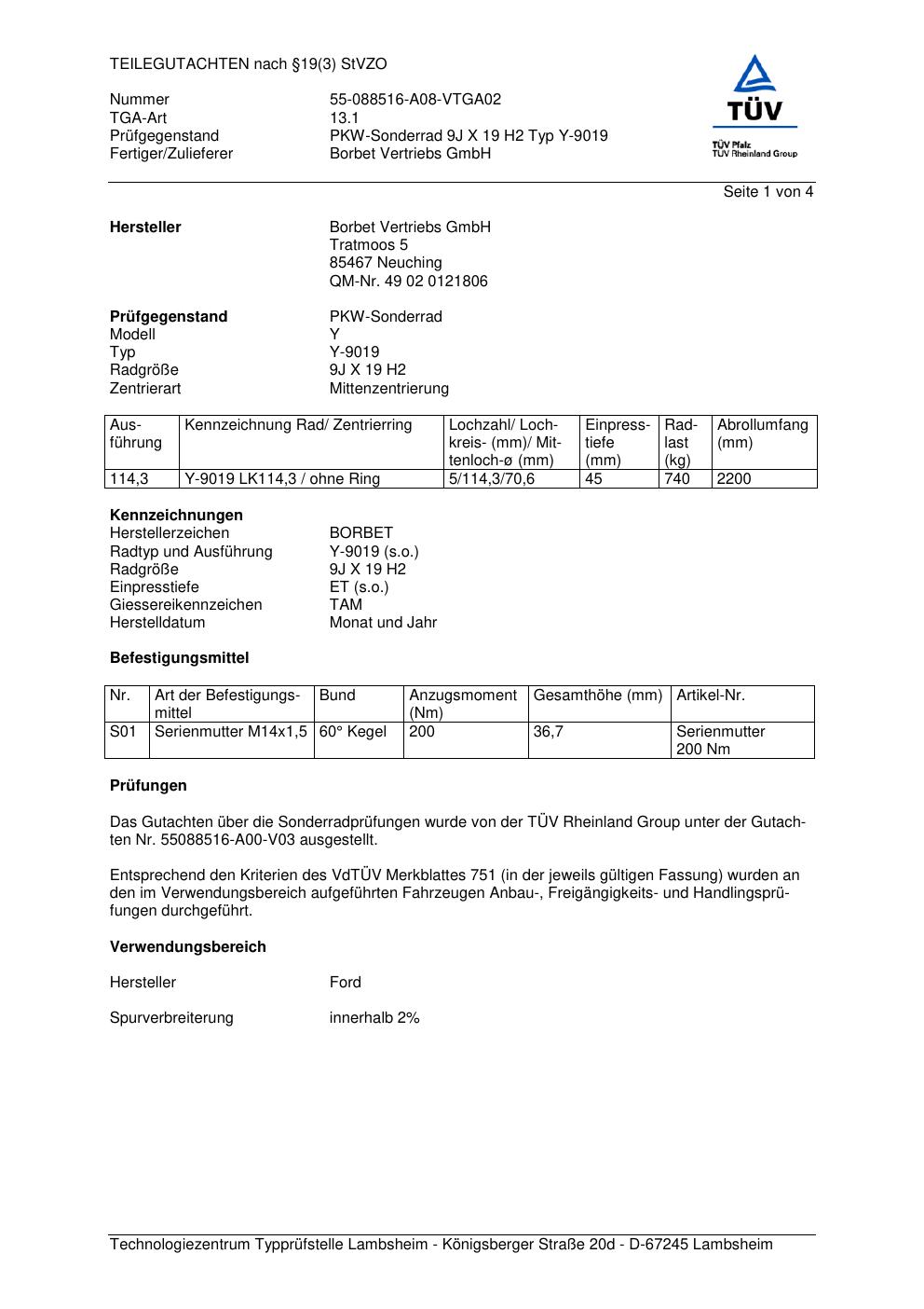 Dieses Gutachten (teilegutachten) bezieht sich auf die Alufelge Borbet Y-9019 in der Ausführung 9Jx19 ET 0, Mittenloch 0 mm . Im PDF findest du typischerweise zulässige Reifengrößen, Auflagen/Anbauhinweise und – je nach Dokument – Hinweise zur Eintragung.
