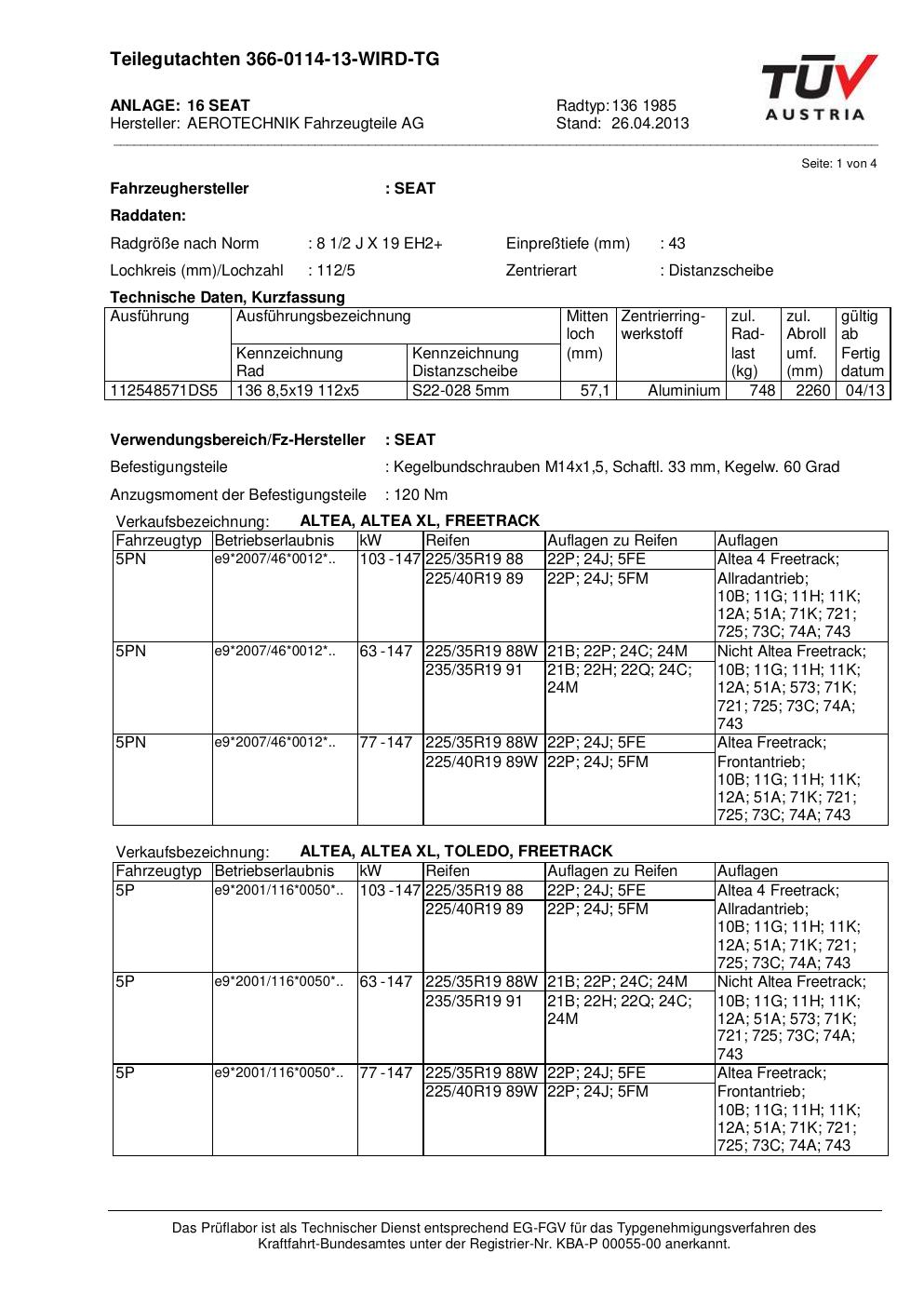 Dieses Gutachten (teilegutachten) bezieht sich auf die Alufelge ATS 136 1985 in der Ausführung 2Jx19 ET 0, Mittenloch 0 mm . Im PDF findest du typischerweise zulässige Reifengrößen, Auflagen/Anbauhinweise und – je nach Dokument – Hinweise zur Eintragung.
