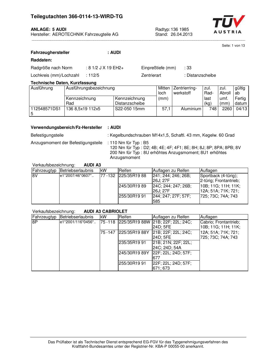 Dieses Gutachten (teilegutachten) bezieht sich auf die Alufelge ATS 136 1985 in der Ausführung 2Jx19 ET 0, Mittenloch 0 mm . Im PDF findest du typischerweise zulässige Reifengrößen, Auflagen/Anbauhinweise und – je nach Dokument – Hinweise zur Eintragung.