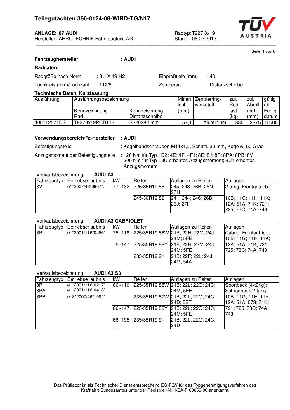 Dieses Gutachten (teilegutachten) bezieht sich auf die Alufelge ATS T927 8x19 in der Ausführung 8Jx19 ET 0, Mittenloch 0 mm . Im PDF findest du typischerweise zulässige Reifengrößen, Auflagen/Anbauhinweise und – je nach Dokument – Hinweise zur Eintragung.