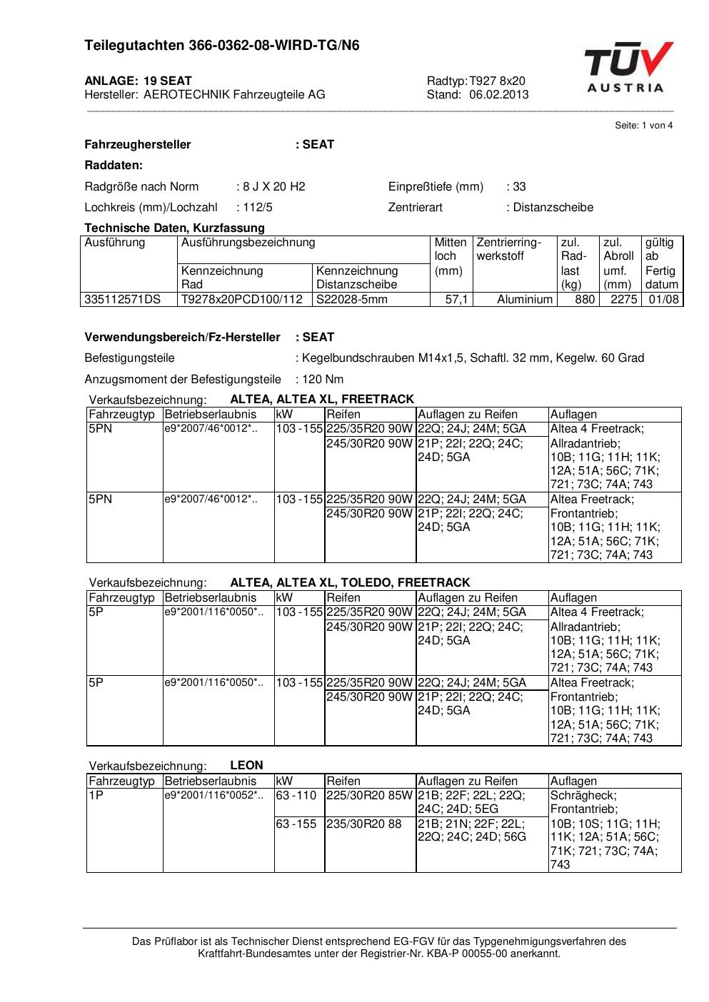 Dieses Gutachten (teilegutachten) bezieht sich auf die Alufelge ATS T927 8x20 in der Ausführung 8Jx2 ET 0, Mittenloch 0 mm . Im PDF findest du typischerweise zulässige Reifengrößen, Auflagen/Anbauhinweise und – je nach Dokument – Hinweise zur Eintragung.