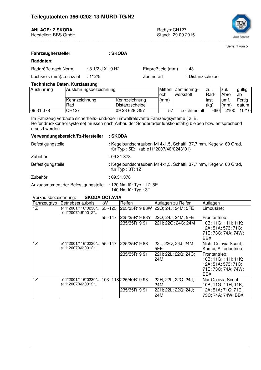 Dieses Gutachten (teilegutachten) bezieht sich auf die Alufelge BBS CH127 in der Ausführung 2Jx19 ET 0, Mittenloch 0 mm . Im PDF findest du typischerweise zulässige Reifengrößen, Auflagen/Anbauhinweise und – je nach Dokument – Hinweise zur Eintragung.
