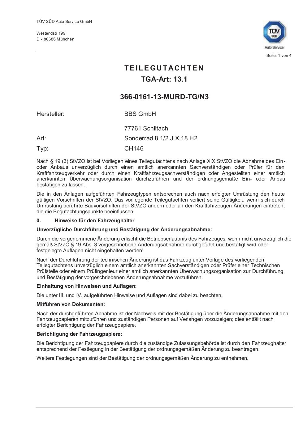 Dieses Gutachten (teilegutachten) bezieht sich auf die Alufelge BBS CH146 in der Ausführung 2Jx18 ET 0, Mittenloch 0 mm . Im PDF findest du typischerweise zulässige Reifengrößen, Auflagen/Anbauhinweise und – je nach Dokument – Hinweise zur Eintragung.