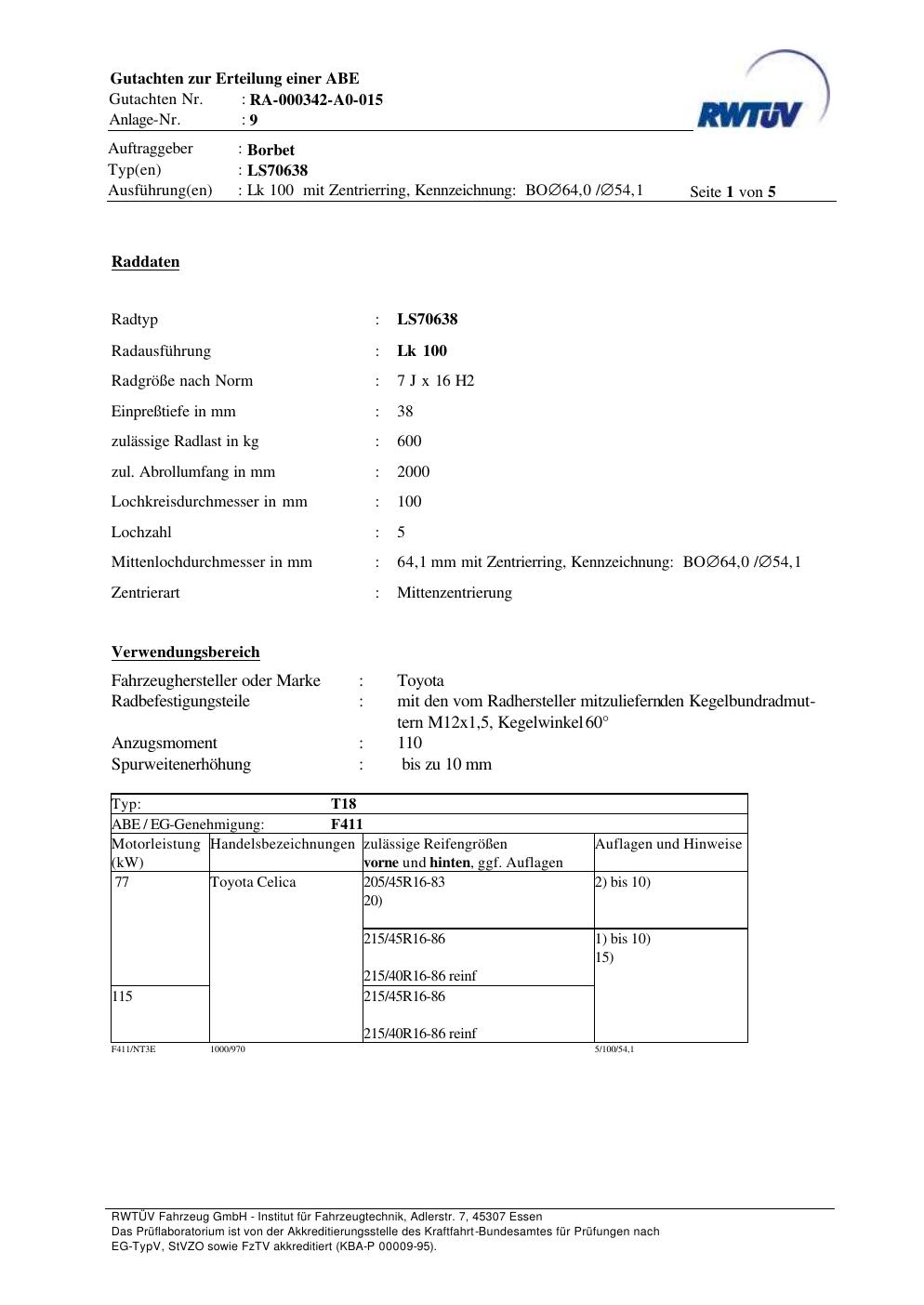 teilegutachten zur Borbet LS70638