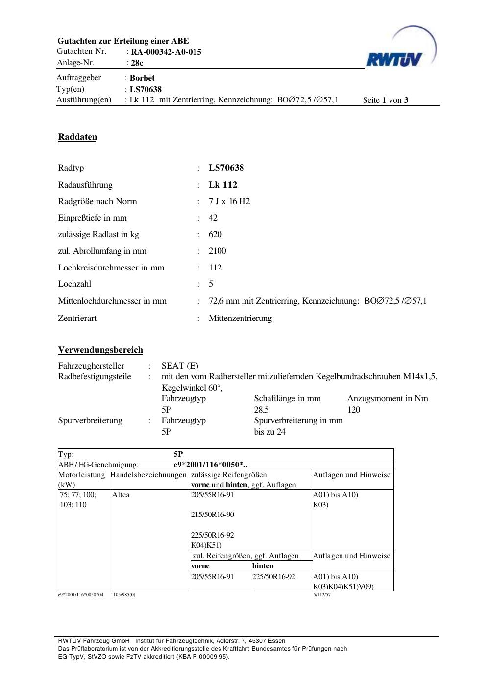 teilegutachten zur Borbet LS70638