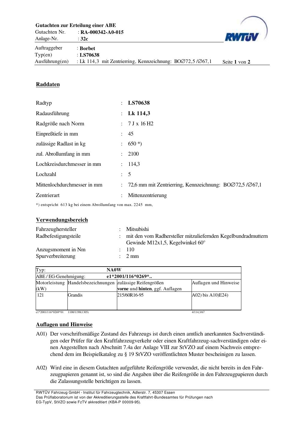 teilegutachten zur Borbet LS70638