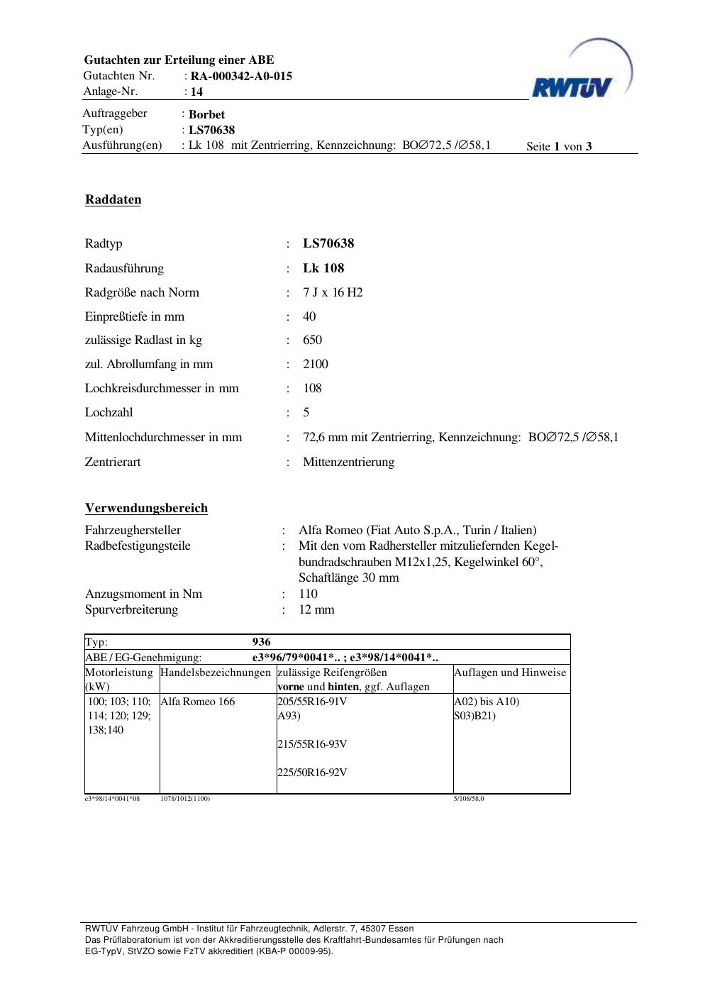 Dieses Gutachten (teilegutachten) bezieht sich auf die Alufelge Borbet LS70638 in der Ausführung ET 0, Mittenloch 0 mm . Im PDF findest du typischerweise zulässige Reifengrößen, Auflagen/Anbauhinweise und – je nach Dokument – Hinweise zur Eintragung.